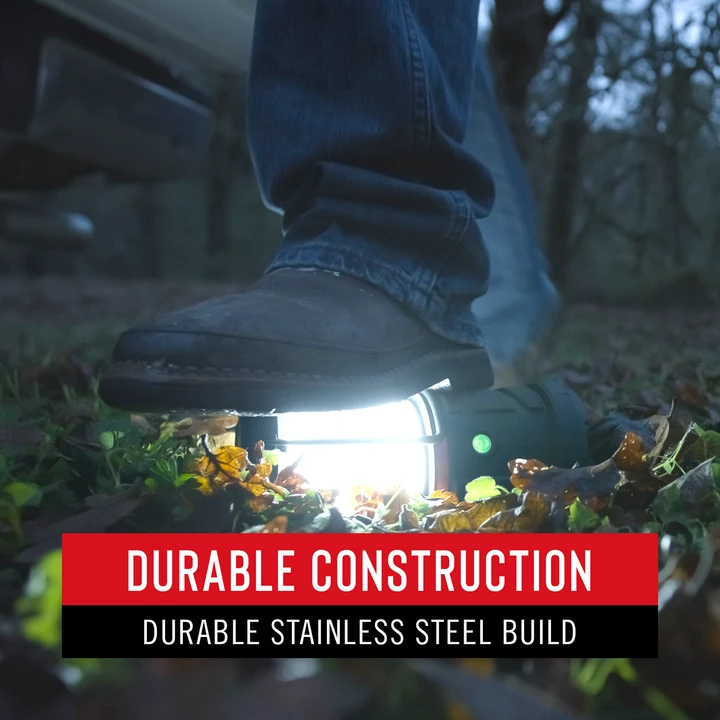 Stand the light on its base, carry it by the swinging handle, or hang it from the easy-stow hook integrated into the handle. Constructed of high-strength nylon and polycarbonate with a stainless steel outer cage, the impact-resistant EAL17 makes dark nights brighter, safer, and more fun.