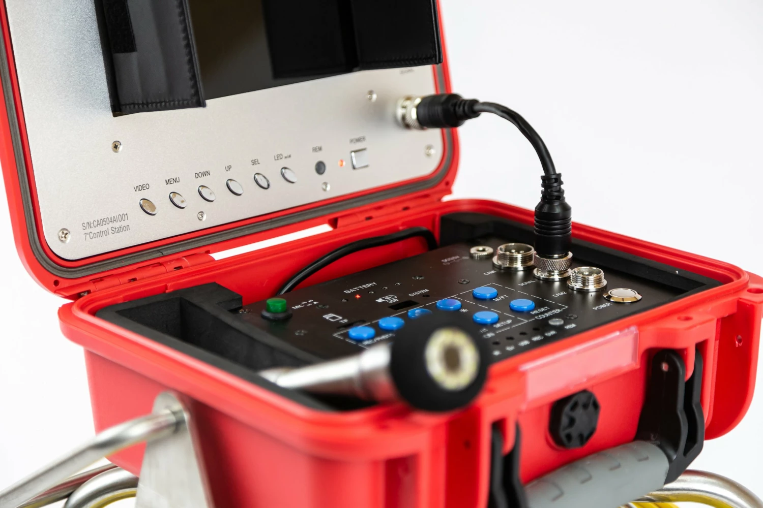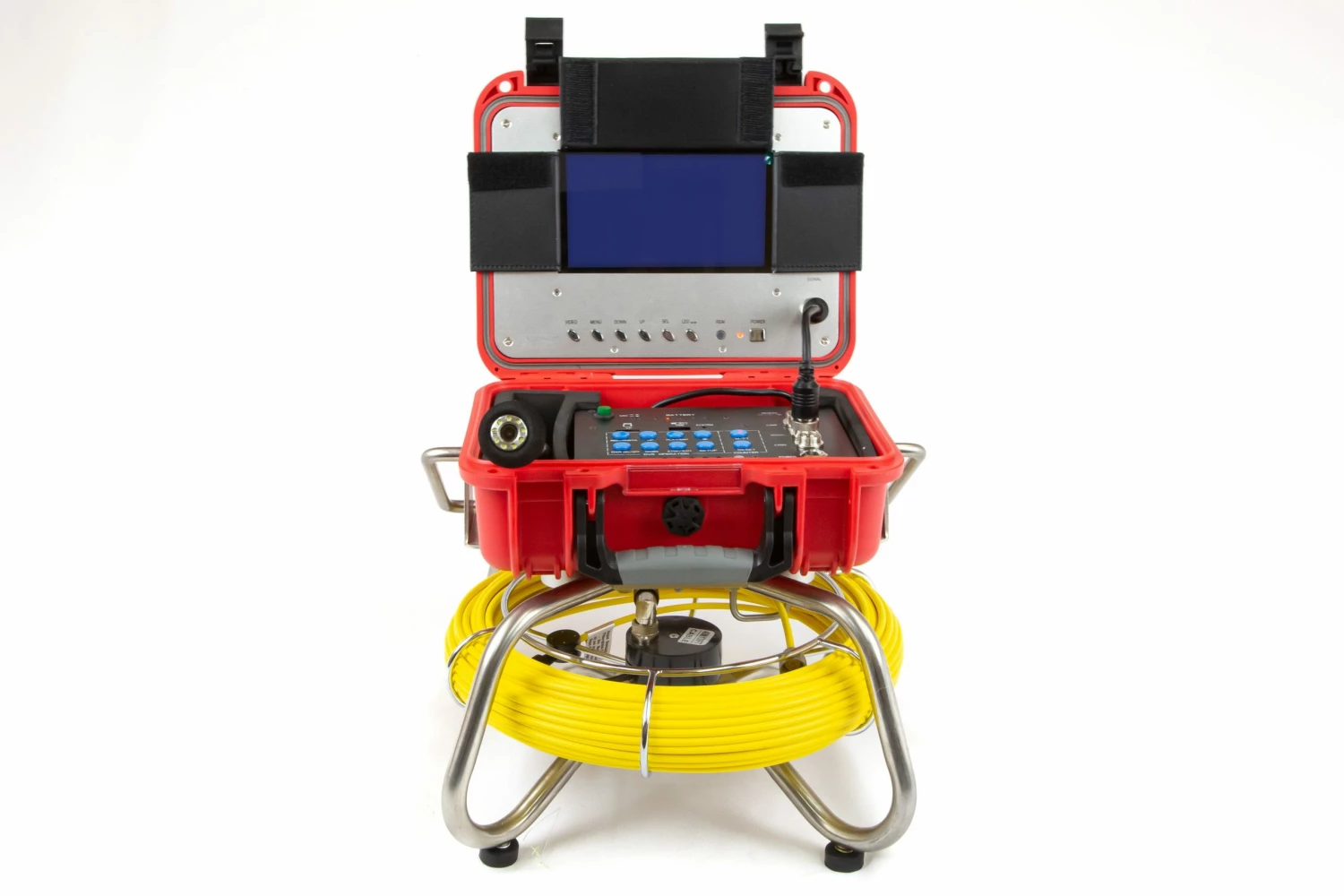 β’ 1β Self Leveling Colour Camera Head w/LED Lights, Comes with Interchangeable skids for traversing through different pipes