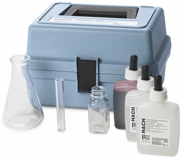 Hach Total Hardness Test Kit Model HA-71A includes three reagents, flask, bottle, measuring tube, instruction sheet, and carrying case.