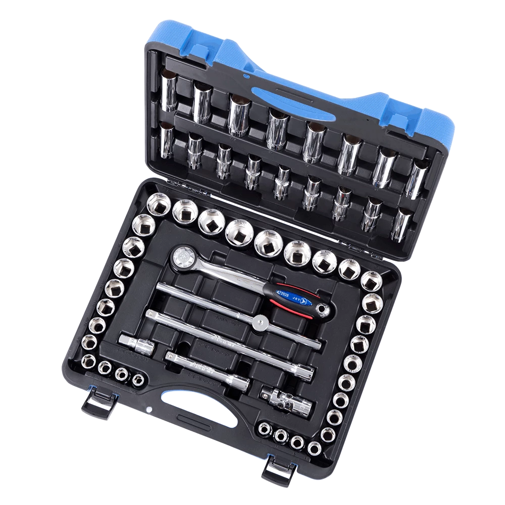 | Accessories Included | 72 tooth high torque ratchet, 2″, 5″ and 10″ extensions, 10″ sliding T-handle, 2-3/4″ universal joint, Blow mould case |
