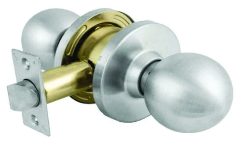 Master Lock Commercial Passage Knob Set has a brushed chrome finish with cylindrical construction for enhanced durability.