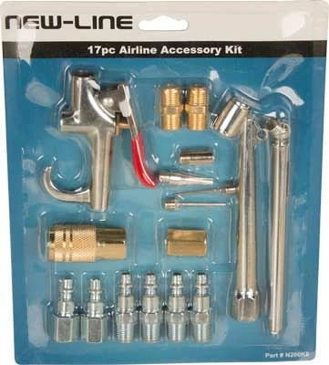 This kit includes a pocket tire pressure gauge, dual inflator air chuck, industrial interchange quick coupling nipples (4xM & 2xFNPT), one industrial interchange FNPT coupler, (2) NPT hex nipples, (1) NPT female coupling, (1) inflator needle, a barbed chuck & adapter, and a blow gun with an extra safety nozzle.