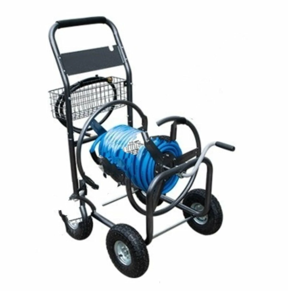 The cart reel itself is made of dark grey die-cast aluminum and has a storage basket underneath the handle.