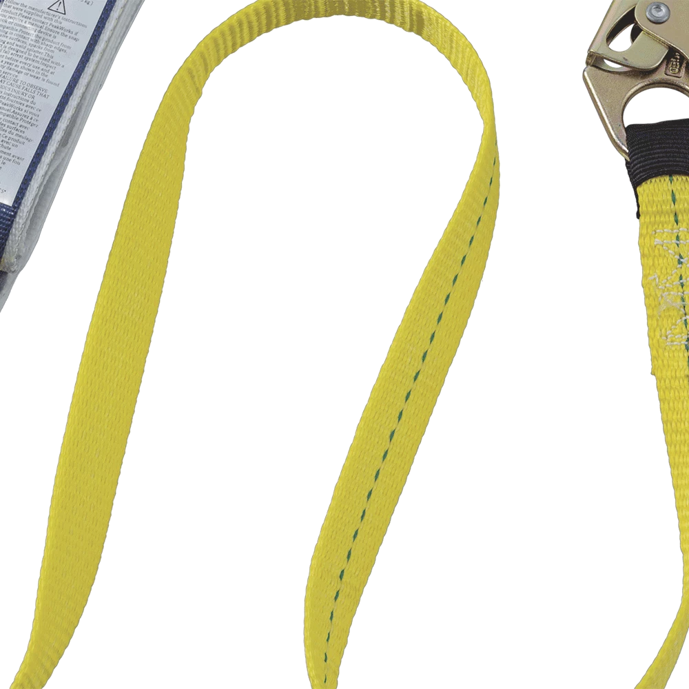 SP (Shock Pack) lanyards are comprised of “tear webbing” which is woven in a manner that allows the webbing to tear when it has a load applied to it. This tearing absorbs a significant amount of downward force under load, reducing injury. This tear webbing is folded and shrink-wrapped into a compact 1 x 2 x 6″ (2.5 x 5 x 15 cm) pack that is sewn into the lanyard next to the body connector.
