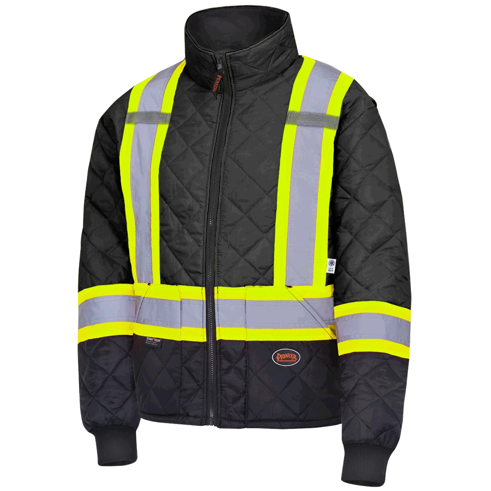 The Pioneer Hi-Viz Quilted Freezer Work Jacket is made with diamond quilted polyester with 3.5 oz (120 GSM) insulation. High Visibility markings are double-stitched StarTechβ’ reflective tape.