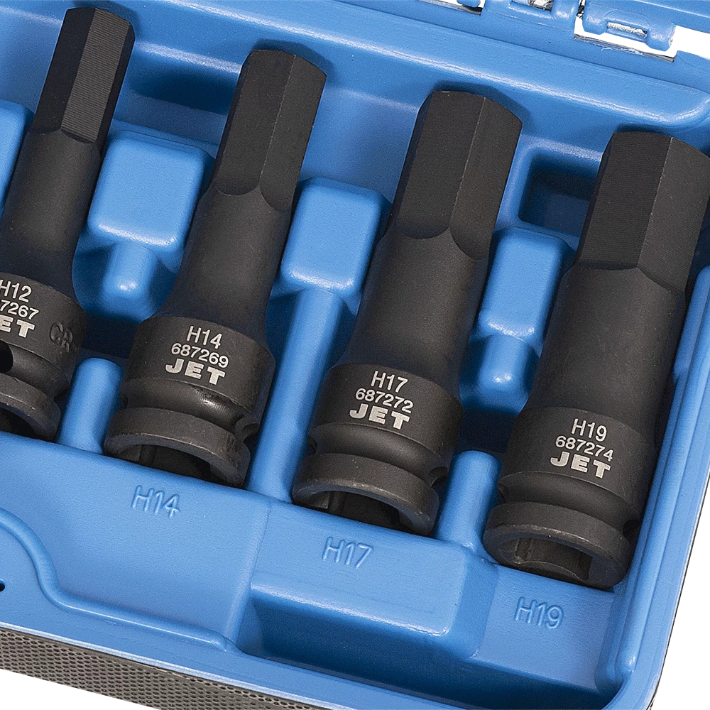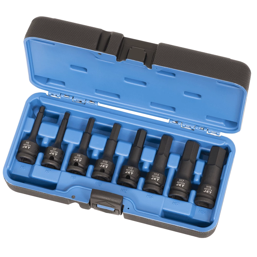 Jet 1/2″ Dr. Deep Impact Socket Set includes: 3/8, 7/16, 1/2, 9/16, 5/8, 11/16, 3/4, 13/16, 7/8, 15/16, 1, 1-1/16, 1-1/8, 1-3/16, 1-1/4, 1-5/16, 1-3/8, 1-7/16, 1-1/2″