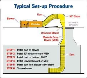Ramfan Manhole Entry Continuous Airflow Device allows workers to enter and exit small man-size opening while maintaining continuous ventilation. Without such a device, duct fills the manhole opening, preventing rapid entry and exit.