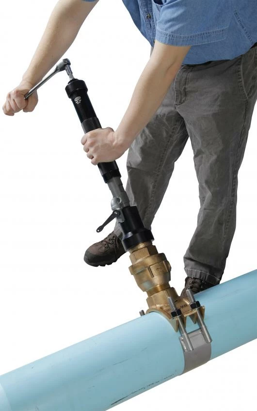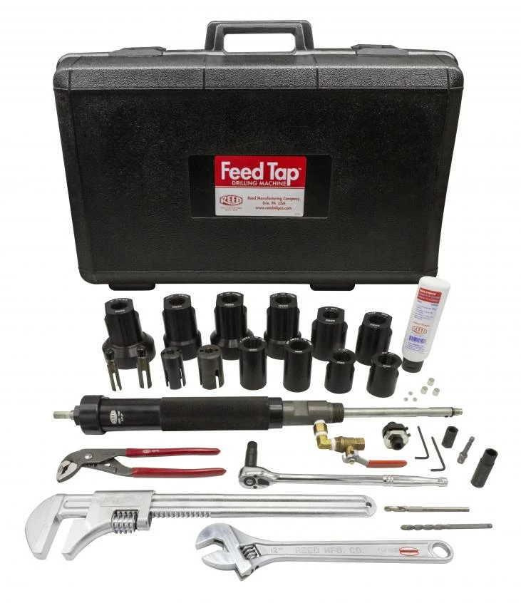 Reed Feed Tap Drilling Machine Kit contains machine, ratchet wrench and socket, corp adapters and cutters to saddle tap plastic pipe only ΒΎβ β 2β for flare, compression and NPT applications.