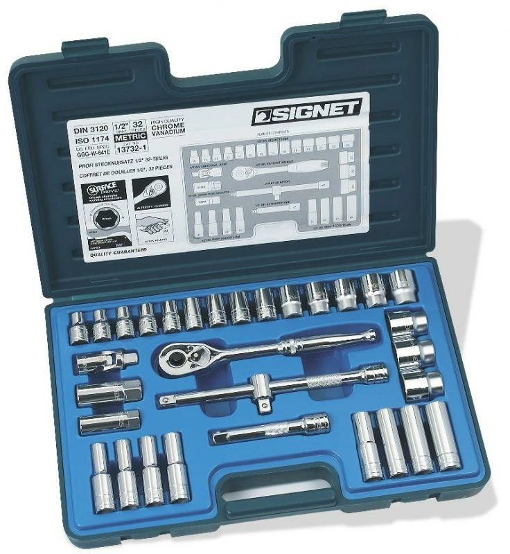Signet 1/2″ Drive 32 Piece Metric Socket Set is contained within a quality, durable blow molded case. This set includes: molded case, professional locking ratchet, universal joint, 5″ & 10″ extension bars, 3 way adapter 3/8″ Female x 1/2″ Male.