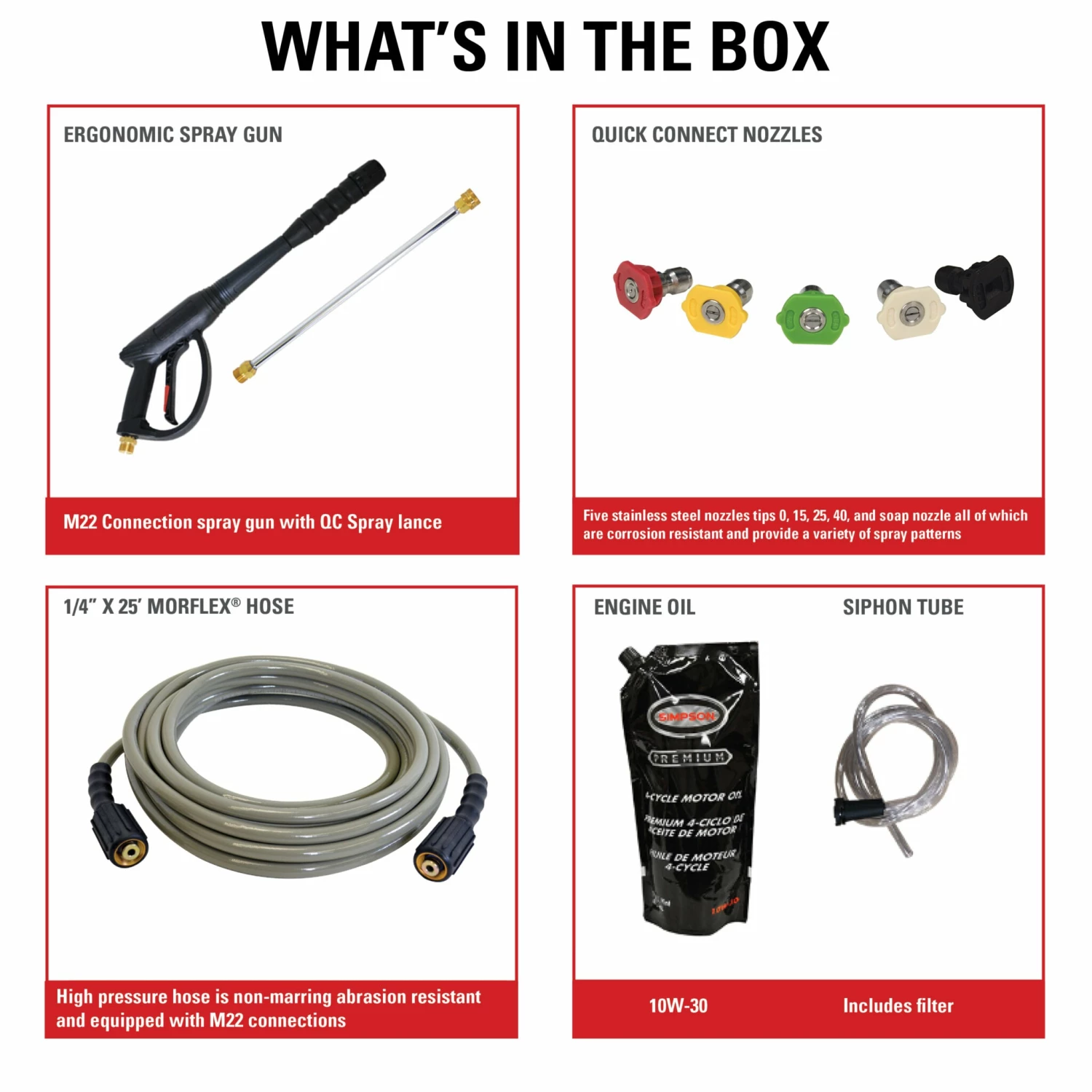 - 5 Quick connect nozzle tips: 0°, 15°, 25°, 40° and soap to use for a variety of cleaning applications