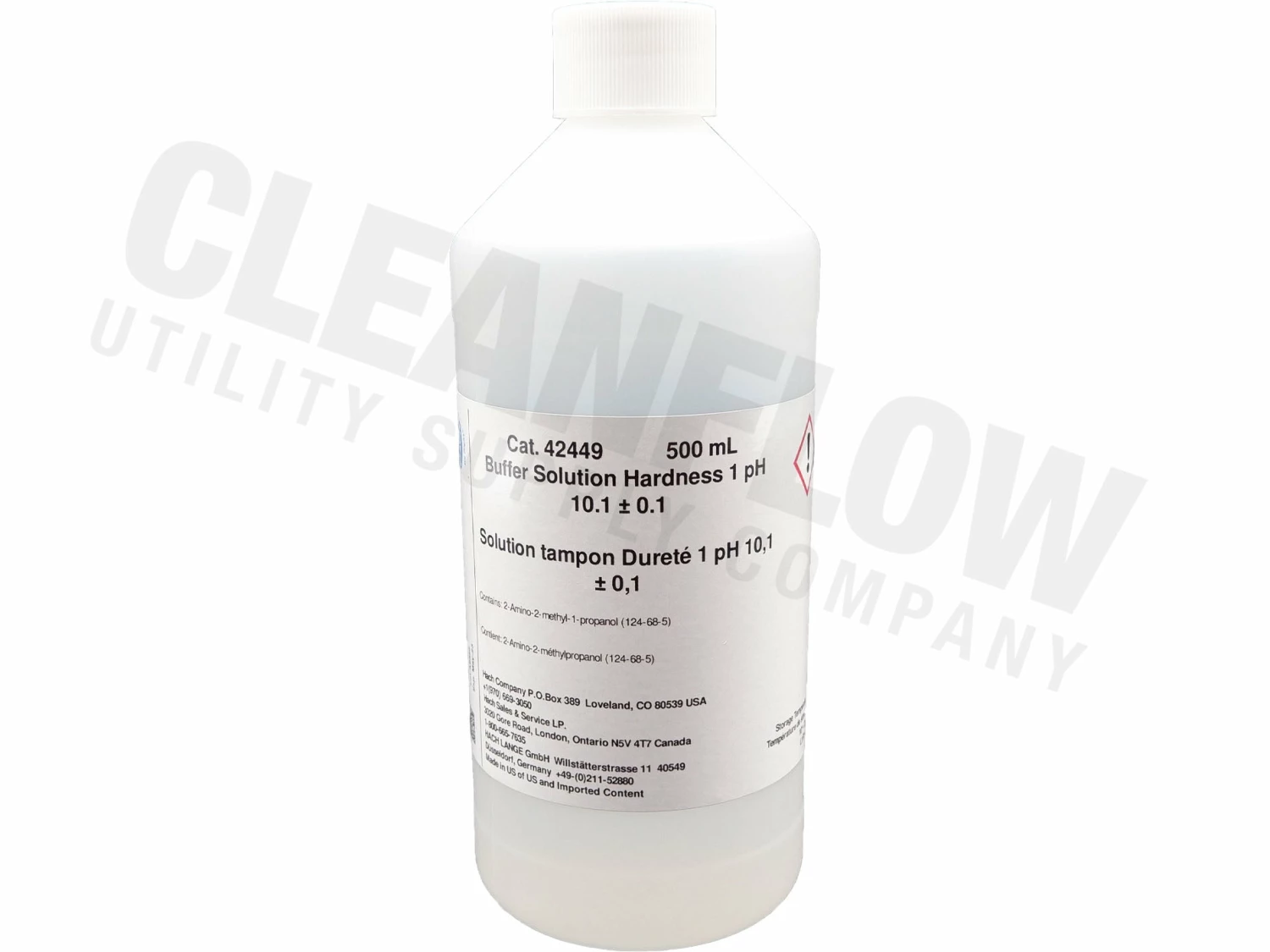 Buffer for hardness and chelant determination by titration, pH 10.1 Β± 0.1 at 20Β°C. Hach methods 8213 and 8226. Also used in Hach Phenols method 8047. 500 mL Bottle