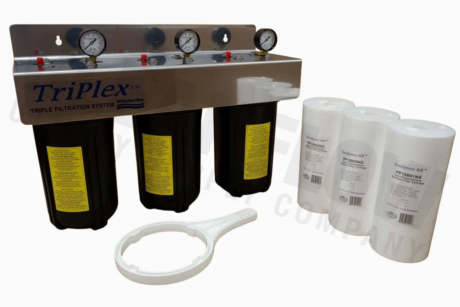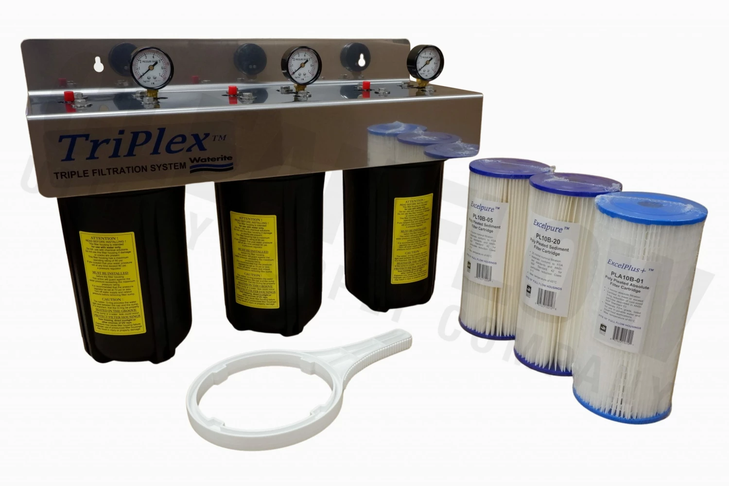 | Pleated Filter Housing Kit (Washable & Reusable Filters) | 10″ Triplex Filter Housing PLUS 5 and 20 Micron Pleated Filters, 1 Micron Absolute Pleated Filter |