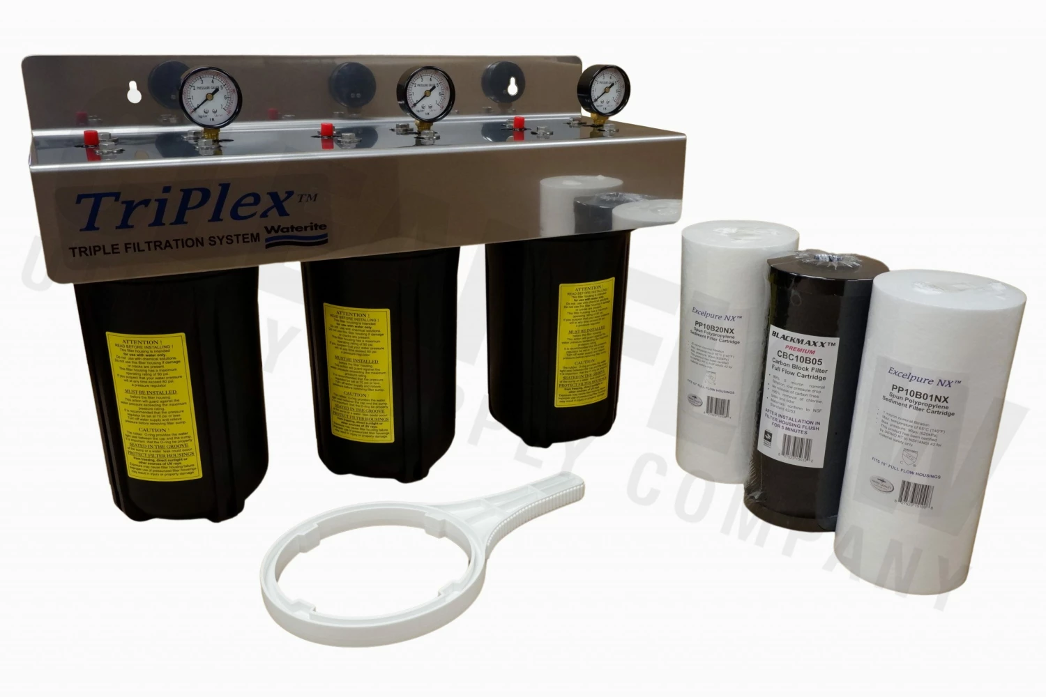These triple filter housing kits are highly adaptable to the user’s individual needs. Any combination of filter types is possible, depending on the source of the water and the required filtered water objectives. We list several common whole house triplex filter arrangements for sale. For many customers these arrangements will work well, but please keep in mind that you may require a different filter arrangement depending on the quality of your water and your own personal needs.