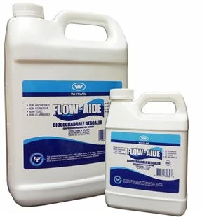 Whitlam Flow-Aide Biodegradable Descaler safely removes scale, lime and rust. It is non-corrosive, nontoxic, and has zero VOC. Certified to NSF/ANSI 60 for use as a CLR cleaner in potable water systems. NSF Registered for use in beverage, pharmaceutical, bottling, poultry, and other food processing plants.