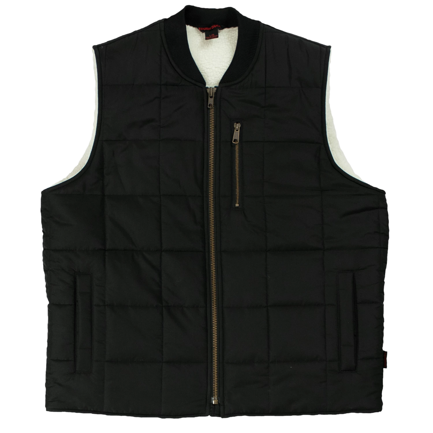 This classic Tough Duck Box Quilted Vest has got a vintage 1970s trucker vest feel but with modern conveniences like inside media and security pockets, and a water resistant finish. It has a knit collar and the lining is a woolly Sherpa for warmth. You donβt need to own a Trans-Am to wear this vest, but it helps.